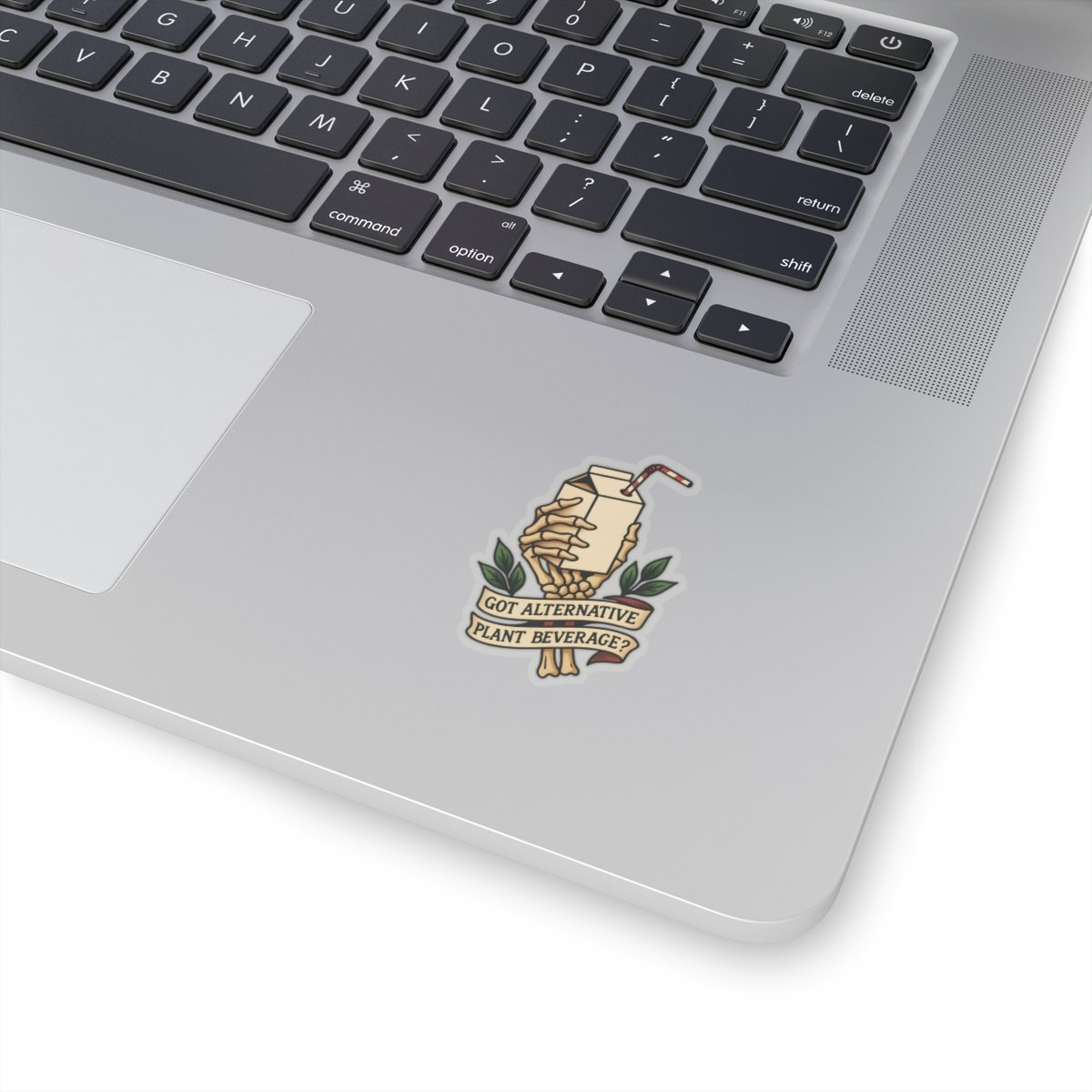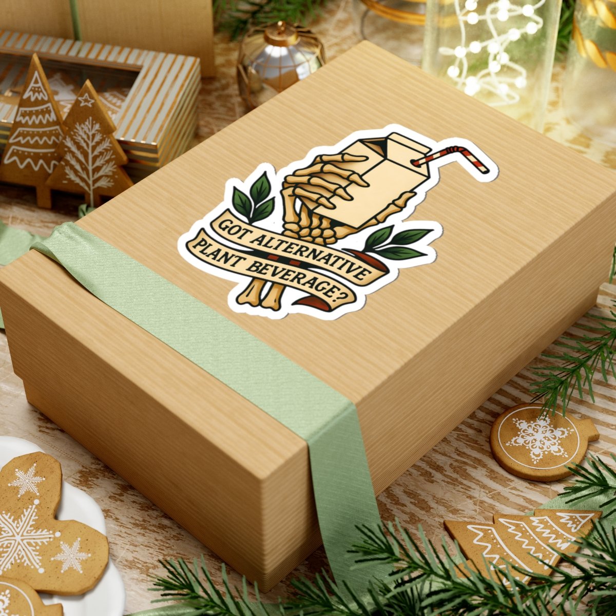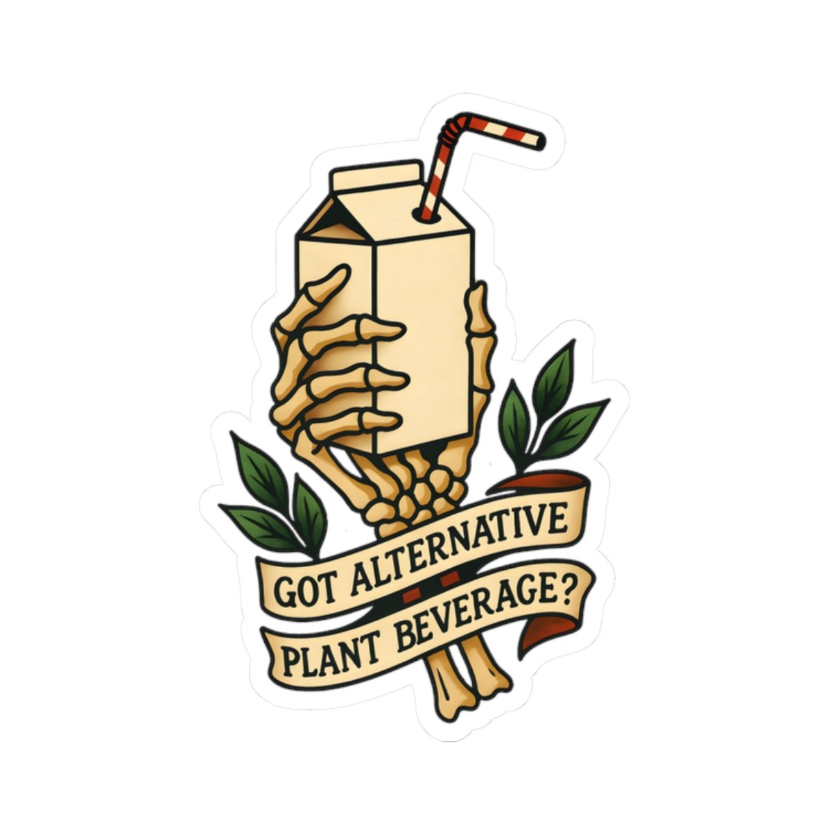 This “Got Alternative Plant Beverage?” sticker features a bold skeleton hand gripping a non-dairy milk carton with a straw in a classic retro tattoo style. Perfect for plant-based foodies, non-dairy drinkers, and fans of vintage flash art, this decal adds a rebellious yet compassionate flair to laptops, water bottles, notebooks, and more.