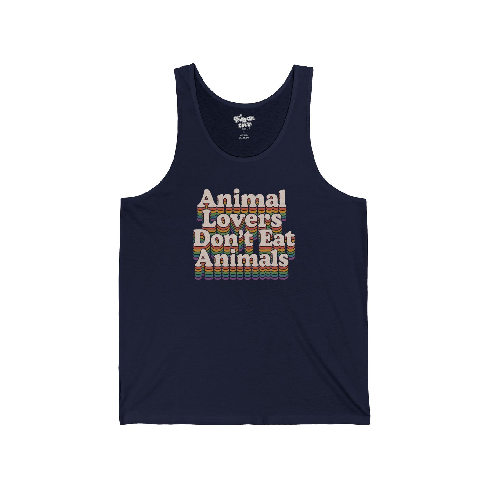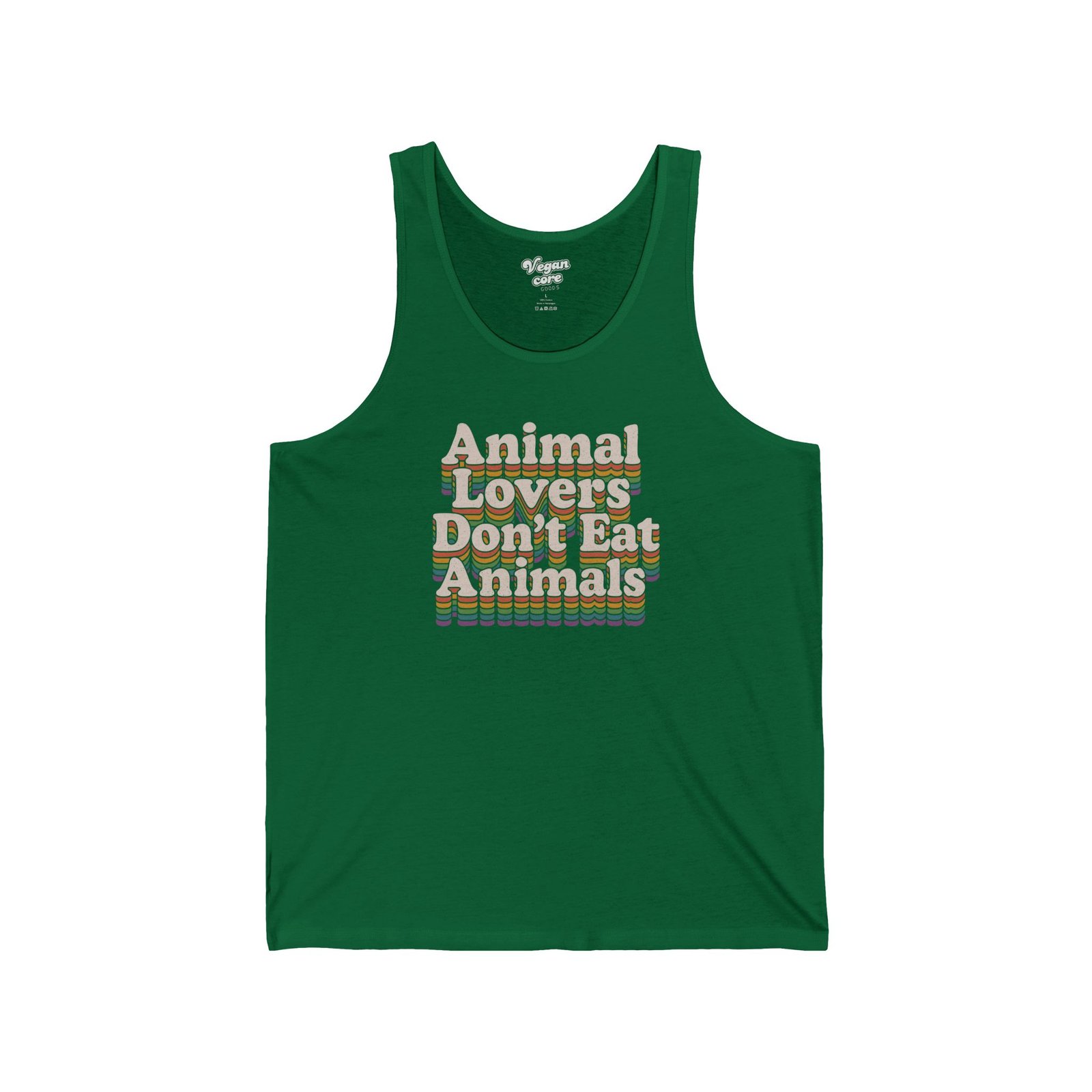 Make a statement with this colorful retro vegan tank. The “Animal Lovers Don’t Eat Animals” design features stacked rainbow typography inspired by vintage 70s graphics. Soft, breathable cotton makes it perfect for everyday wear while spreading a message of compassion and kindness.