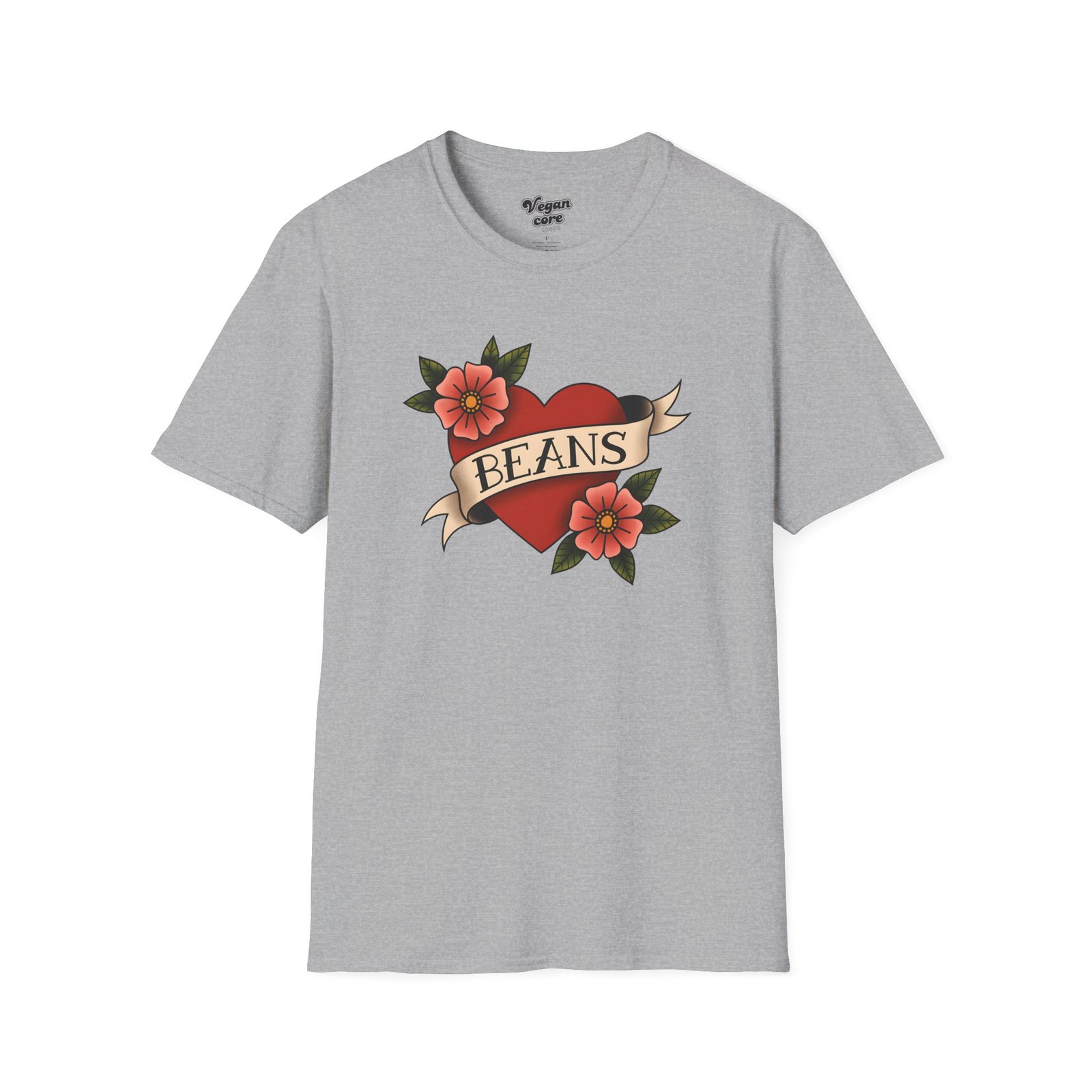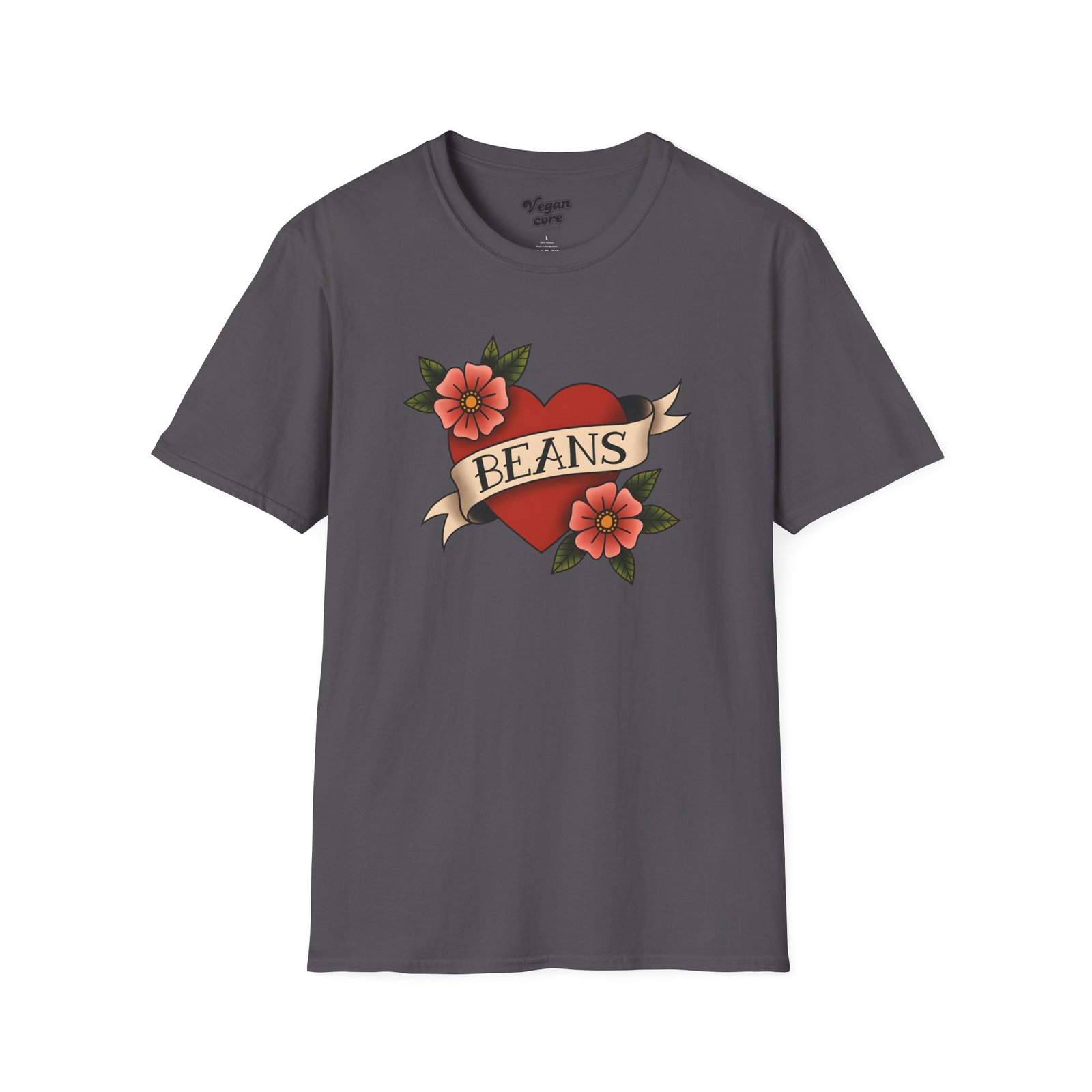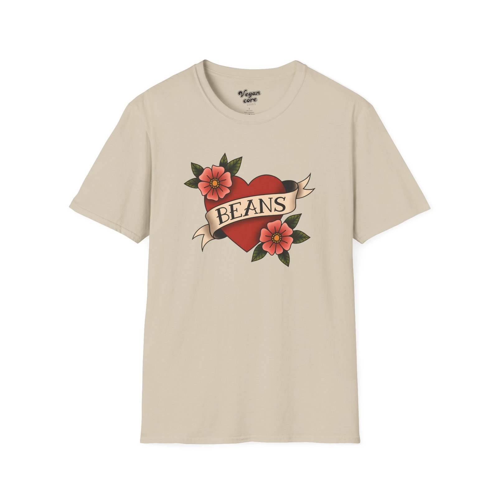 A soft, lightweight tee that wears like a favorite from day one. This classic crewneck features a vintage tattoo–style heart and floral design with the playful word “BEANS” across the banner. The finely spun cotton drapes cleanly, the ribbed collar keeps its shape, and the tubular knit gives a smooth, seam-free silhouette. It slips under a jacket for a casual outing or stands alone on weekend mornings while you brew the first cup. Honest, simple, and comfortable — made to be lived in.
