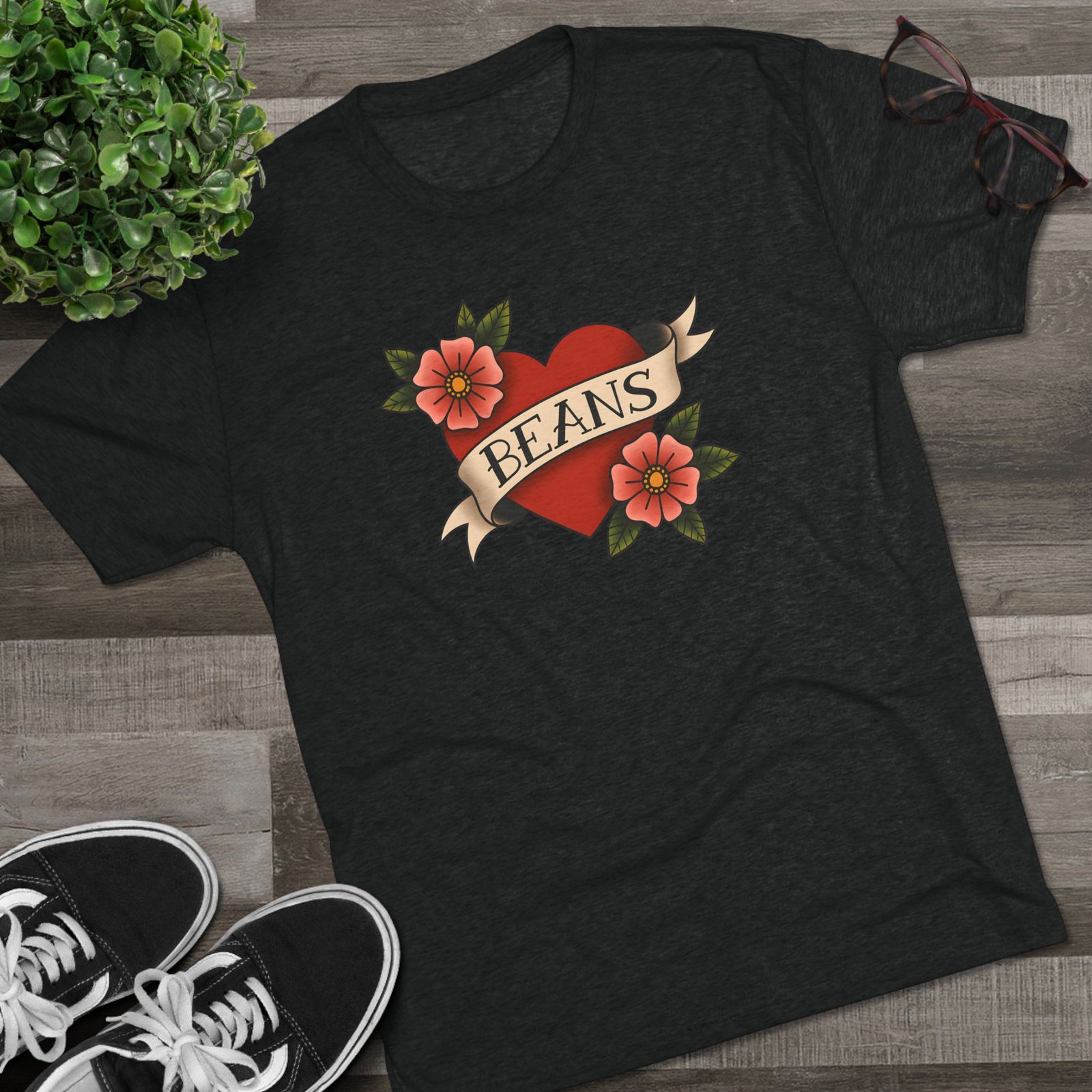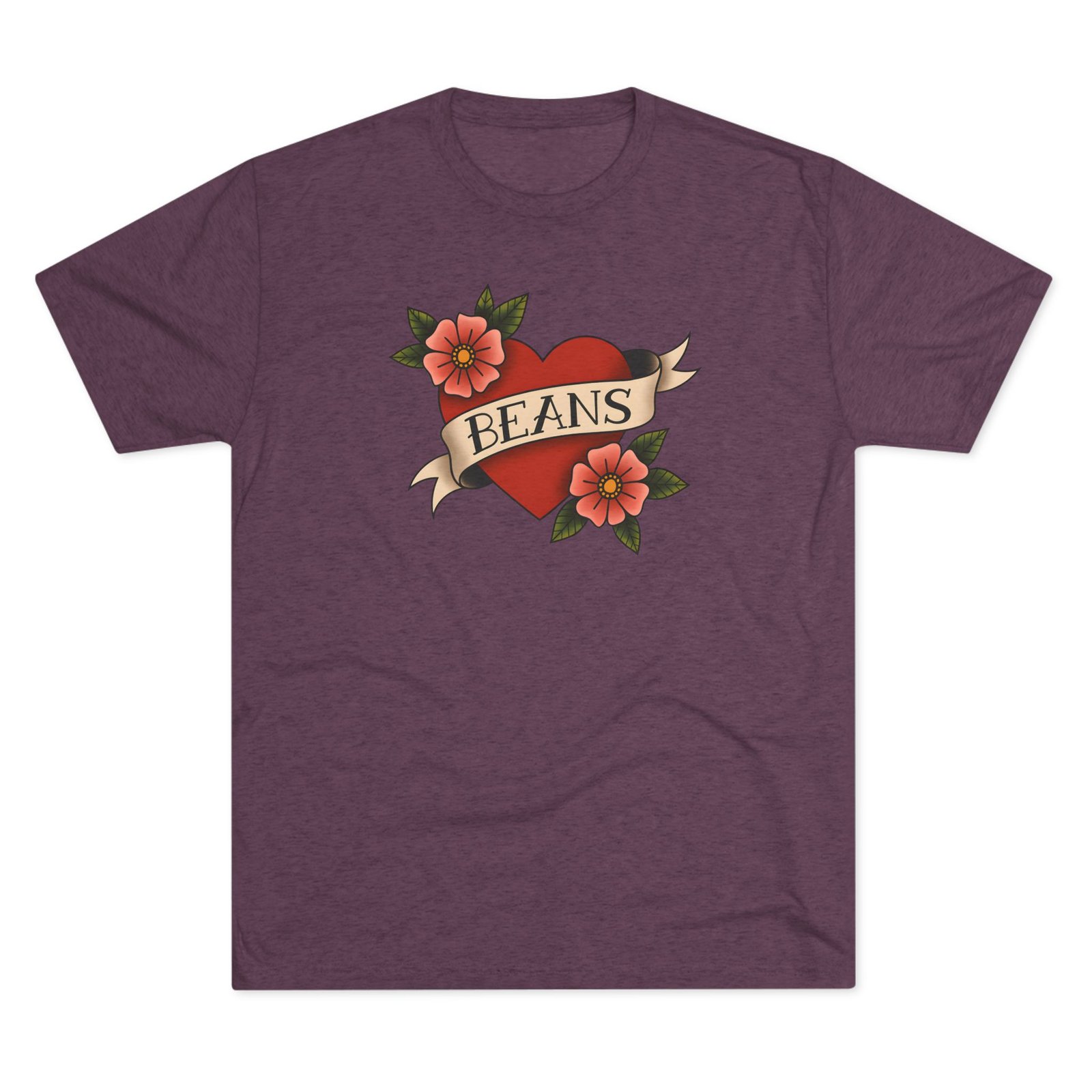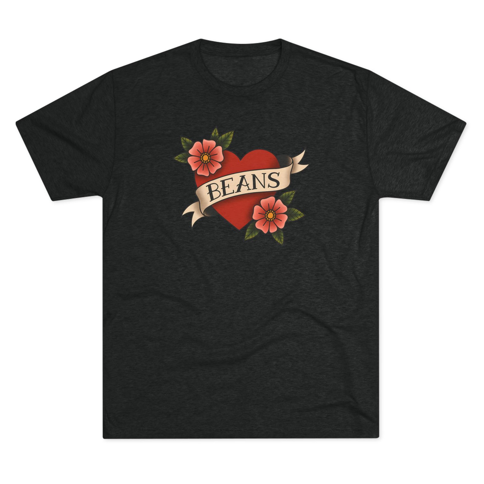 A soft, lightweight tee that wears like a favorite from day one. This classic crewneck features a vintage tattoo–style heart and floral design with the playful word “BEANS” across the banner. Crafted from a soft blend of polyester, cotton, and rayon, it provides a relaxed fit that feels great against the skin.