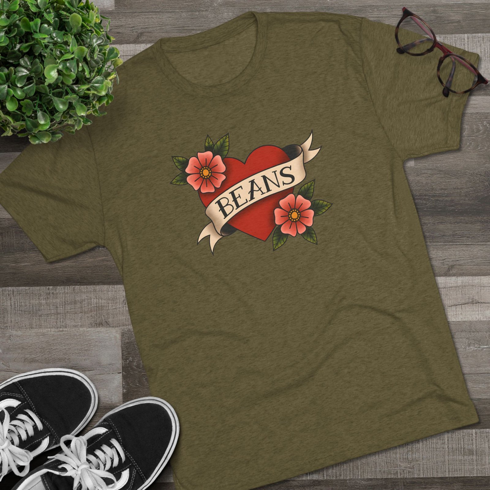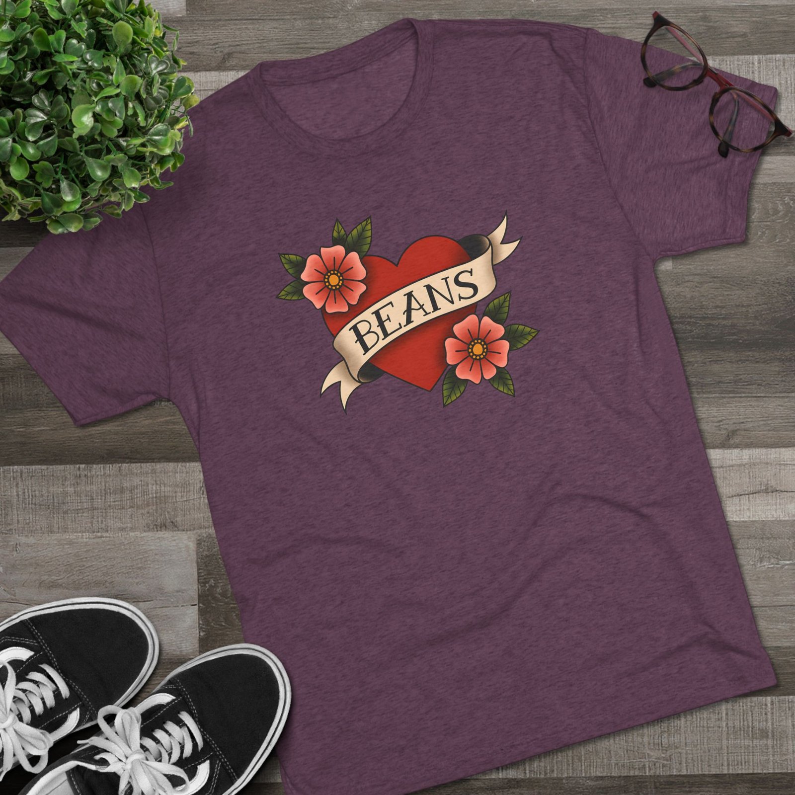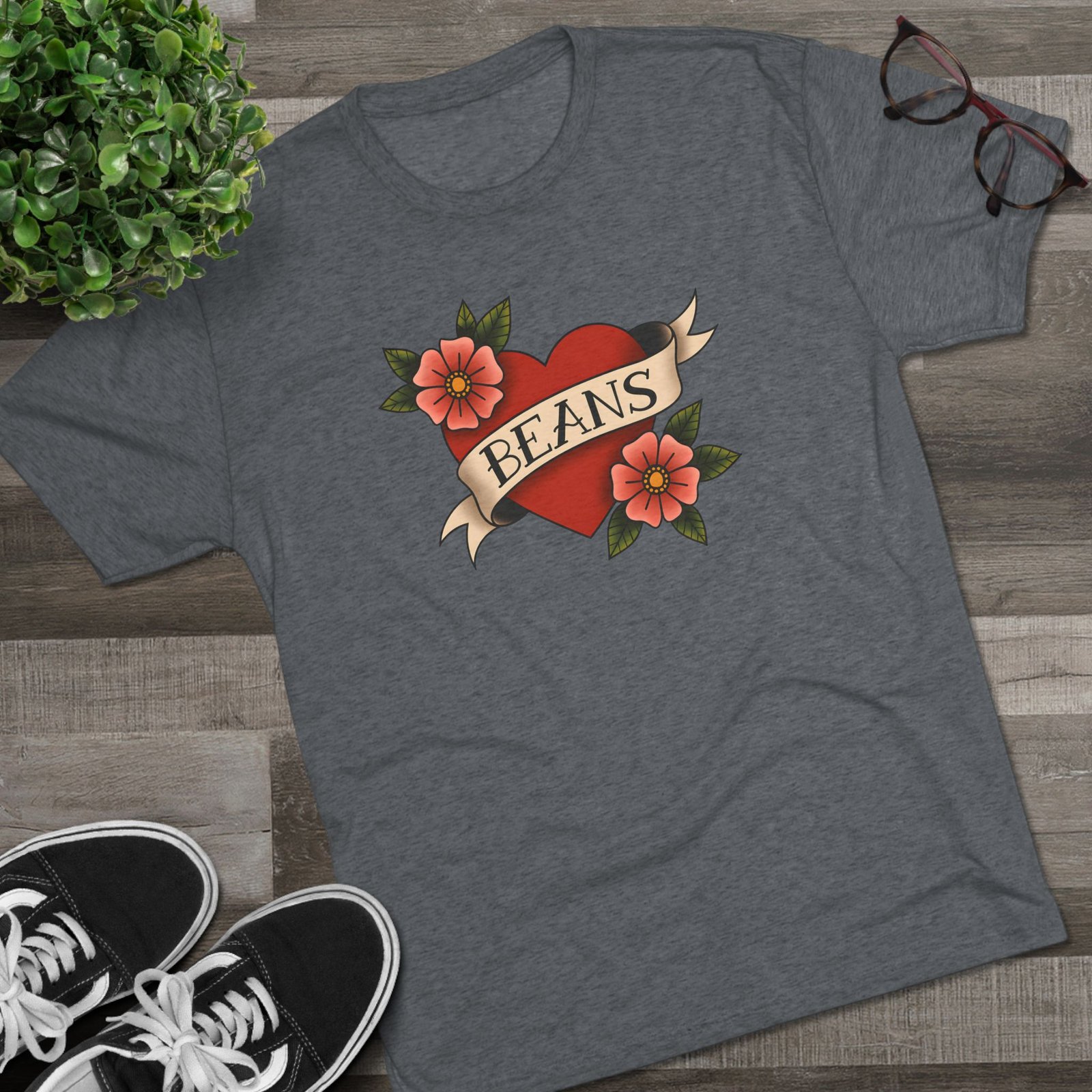 A soft, lightweight tee that wears like a favorite from day one. This classic crewneck features a vintage tattoo–style heart and floral design with the playful word “BEANS” across the banner. Crafted from a soft blend of polyester, cotton, and rayon, it provides a relaxed fit that feels great against the skin.