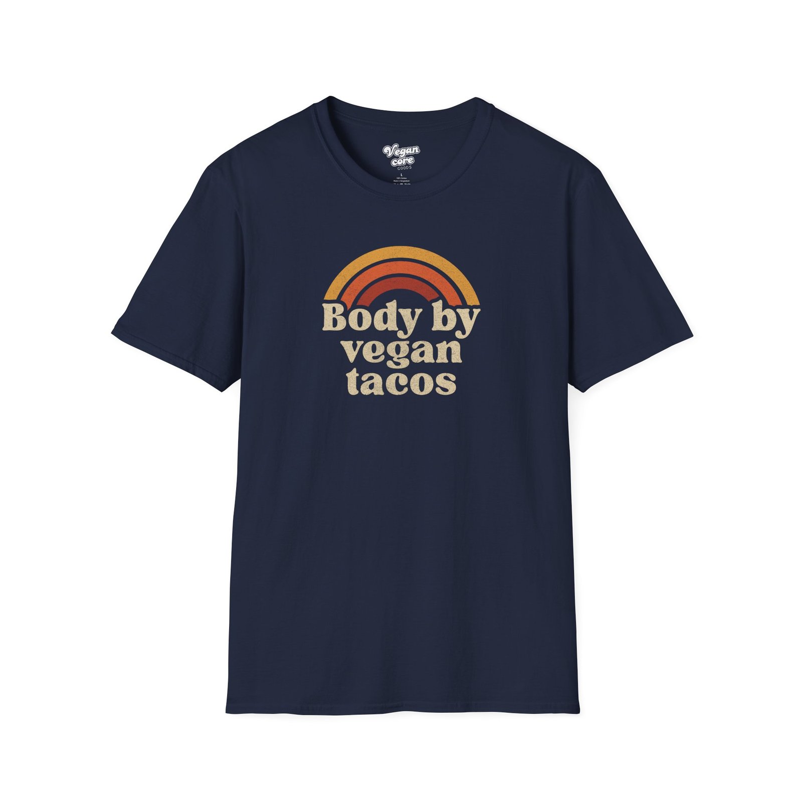 🌱 Powered by plants (and tacos). This “Body by Vegan Tacos” retro typography tee brings 70s nostalgia, warm vintage colors, and vegan humor together in one perfect shirt. Designed in a bold distressed font with a curved sunset stripe, it’s a wearable love letter to everyone’s favorite plant-based food group — tacos. 🌮