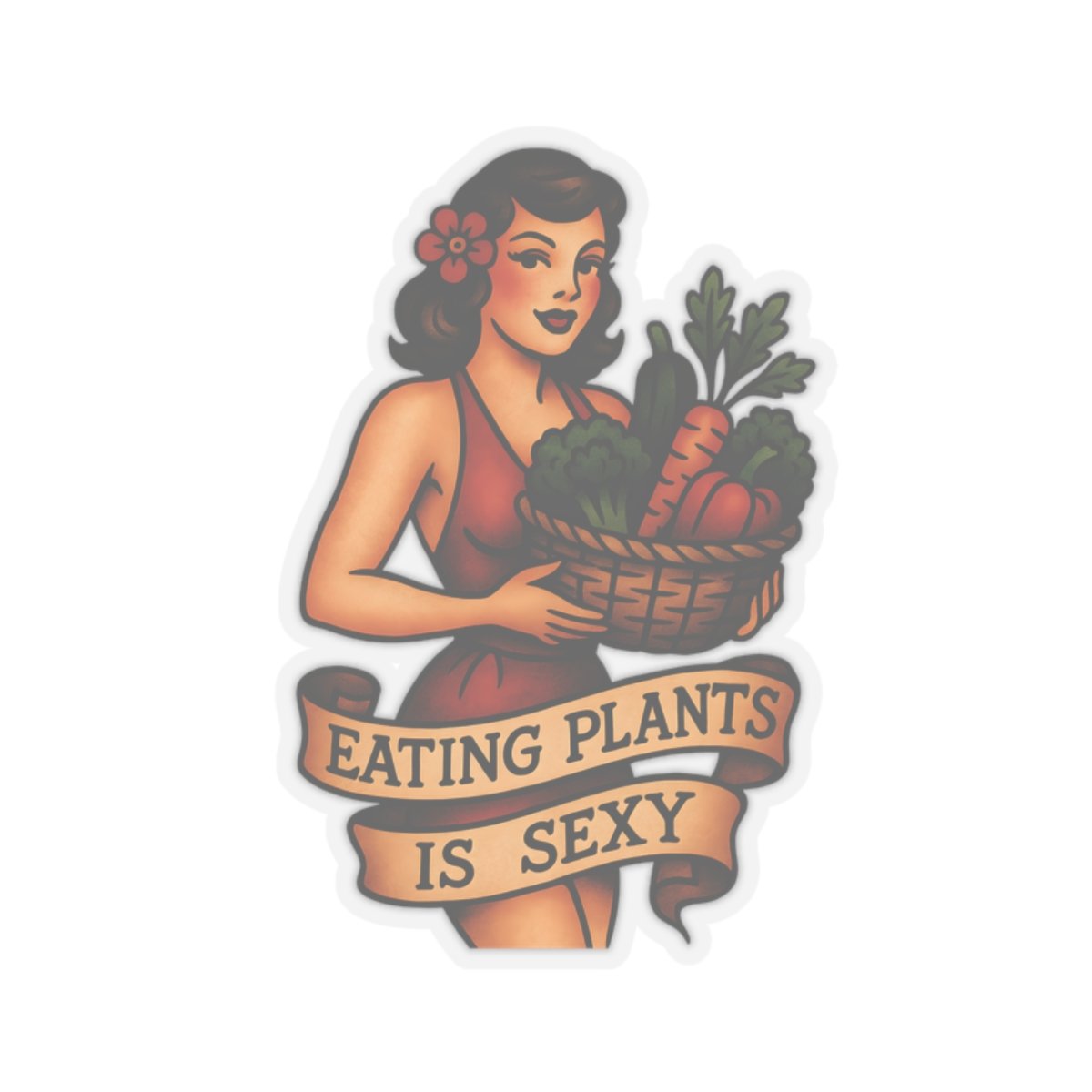 Turn up the charm (and the compassion) with this “Eating Plants Is Sexy” Pin-Up Sticker 🌱💋 Featuring a vintage-inspired tattoo illustration of a confident retro babe holding a basket of veggies beneath a banner that boldly states “EATING PLANTS IS SEXY.”