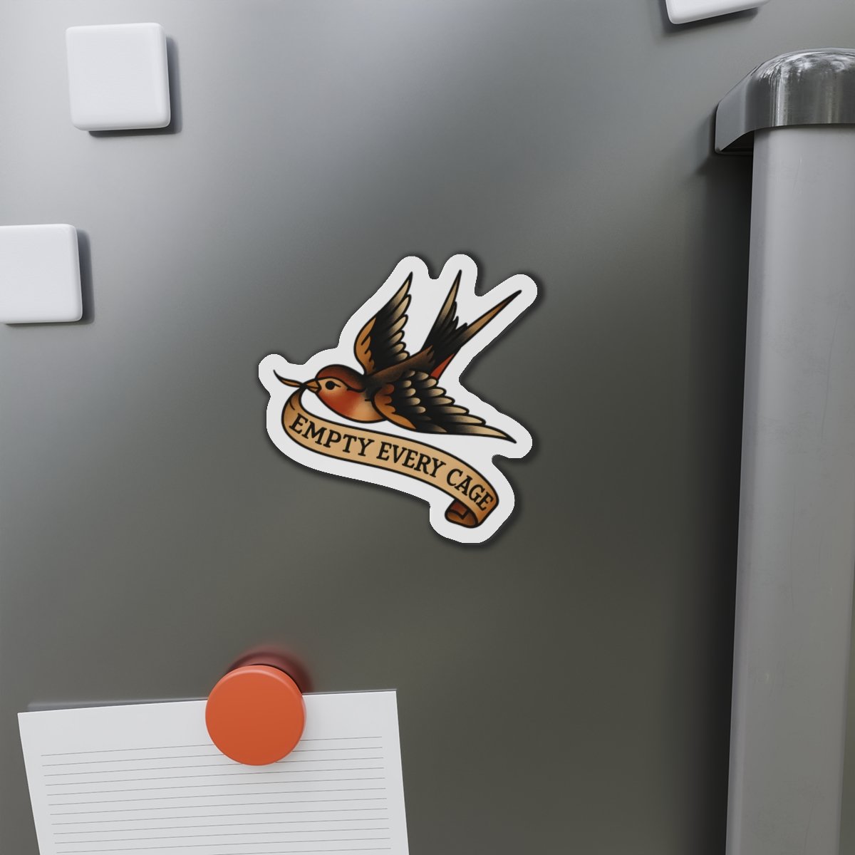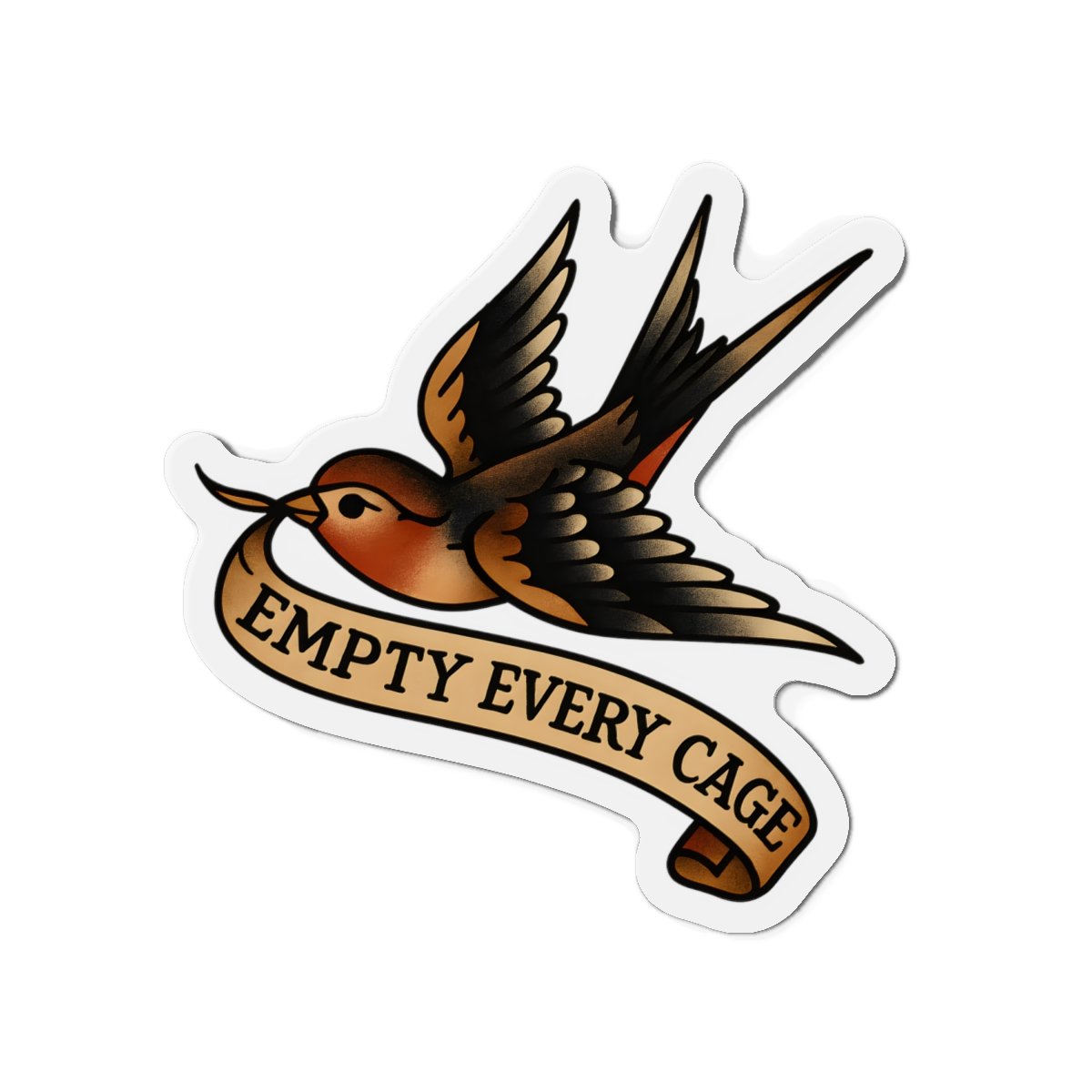 Set your compassion free with this classic tattoo-flash swallow carrying a banner that reads “Empty Every Cage.” Inspired by traditional tattoo art, this classic design blends retro rebellion with vegan ethics — a timeless reminder that freedom isn’t just for humans.