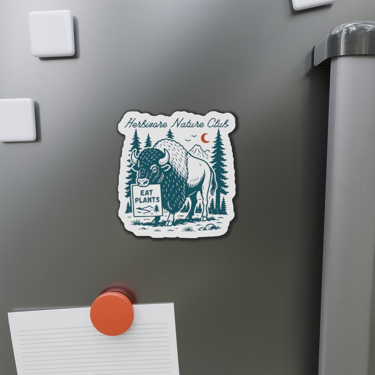 ๐ฟ๐ Herbivore Nature Club โ Eat Plants ๐ฟ๐ Featuring a retro illustration of a bison holding an โEat Plantsโ sign under the moonlight and surrounded by pine trees, this design celebrates wildlife, nature, and cruelty-free living. It makes a perfect eco friendly accent for your fridge, car, locker, or office space.