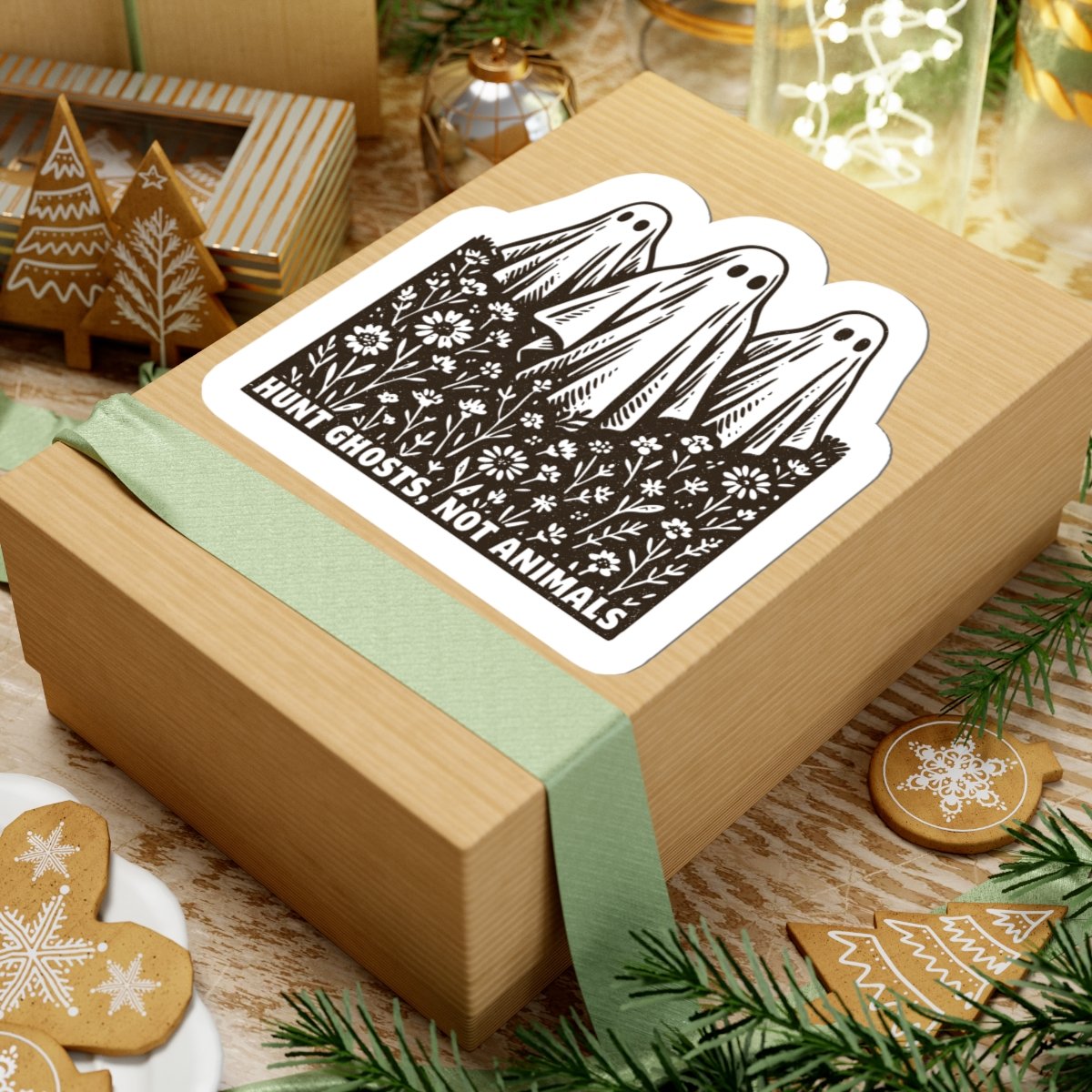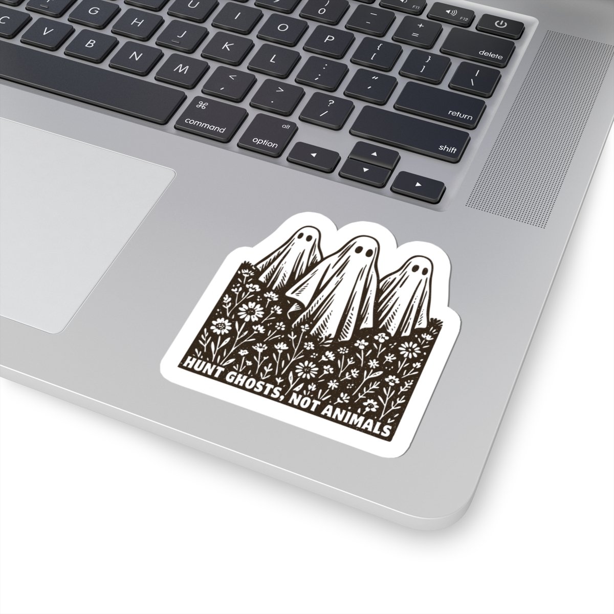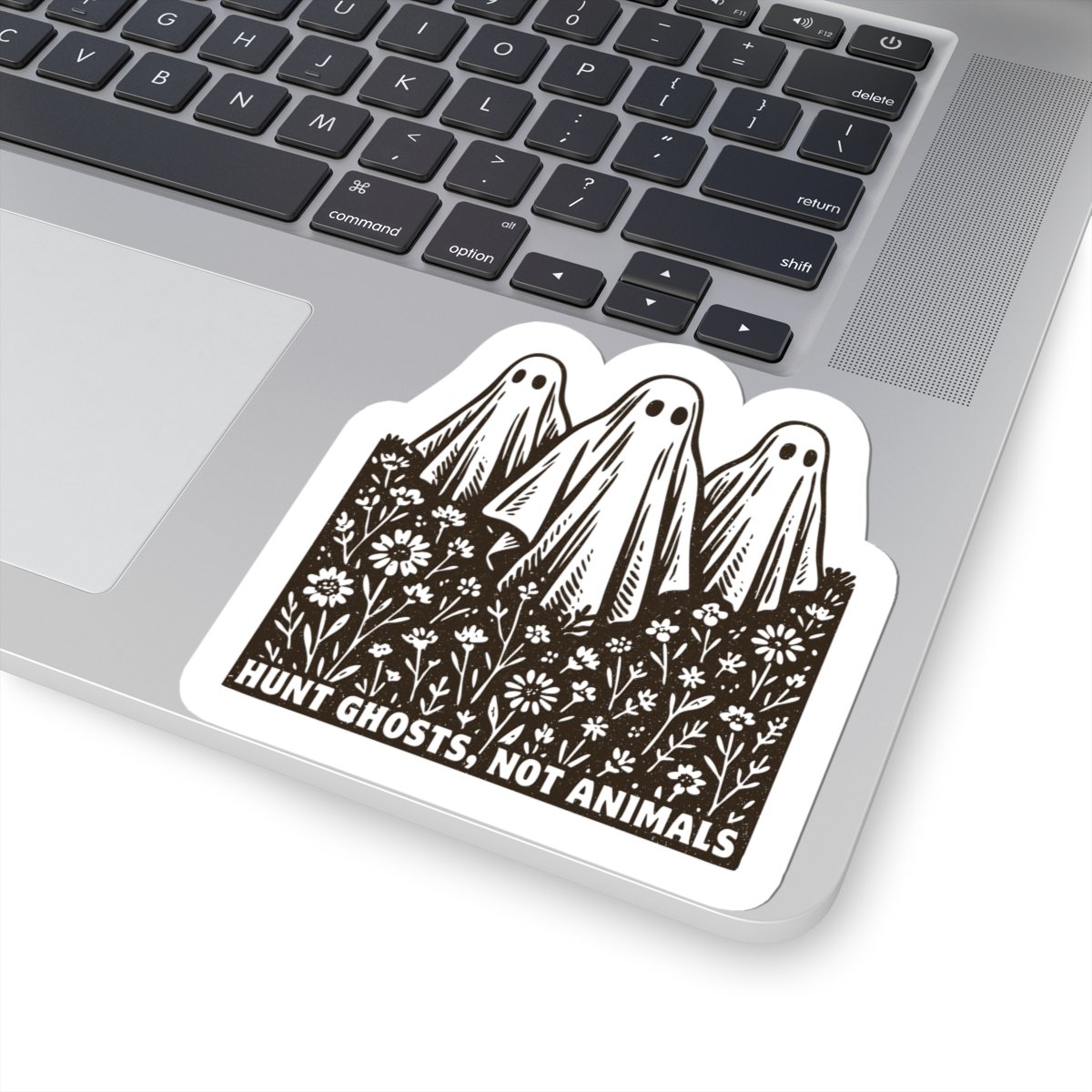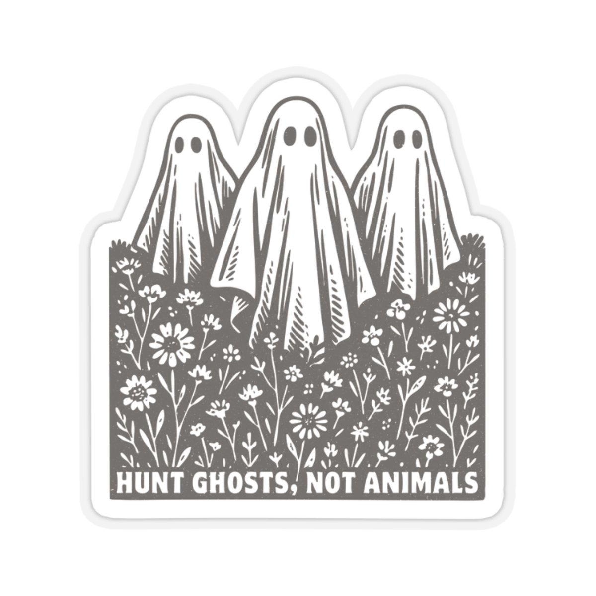Bring a little spooky compassion to your stuff with this “Hunt Ghosts, Not Animals” sticker. Featuring three classic sheet-style ghosts wandering through wildflowers, this design mixes retro Halloween nostalgia with a vegan message — perfect for laptops, water bottles, journals, and more. 👻