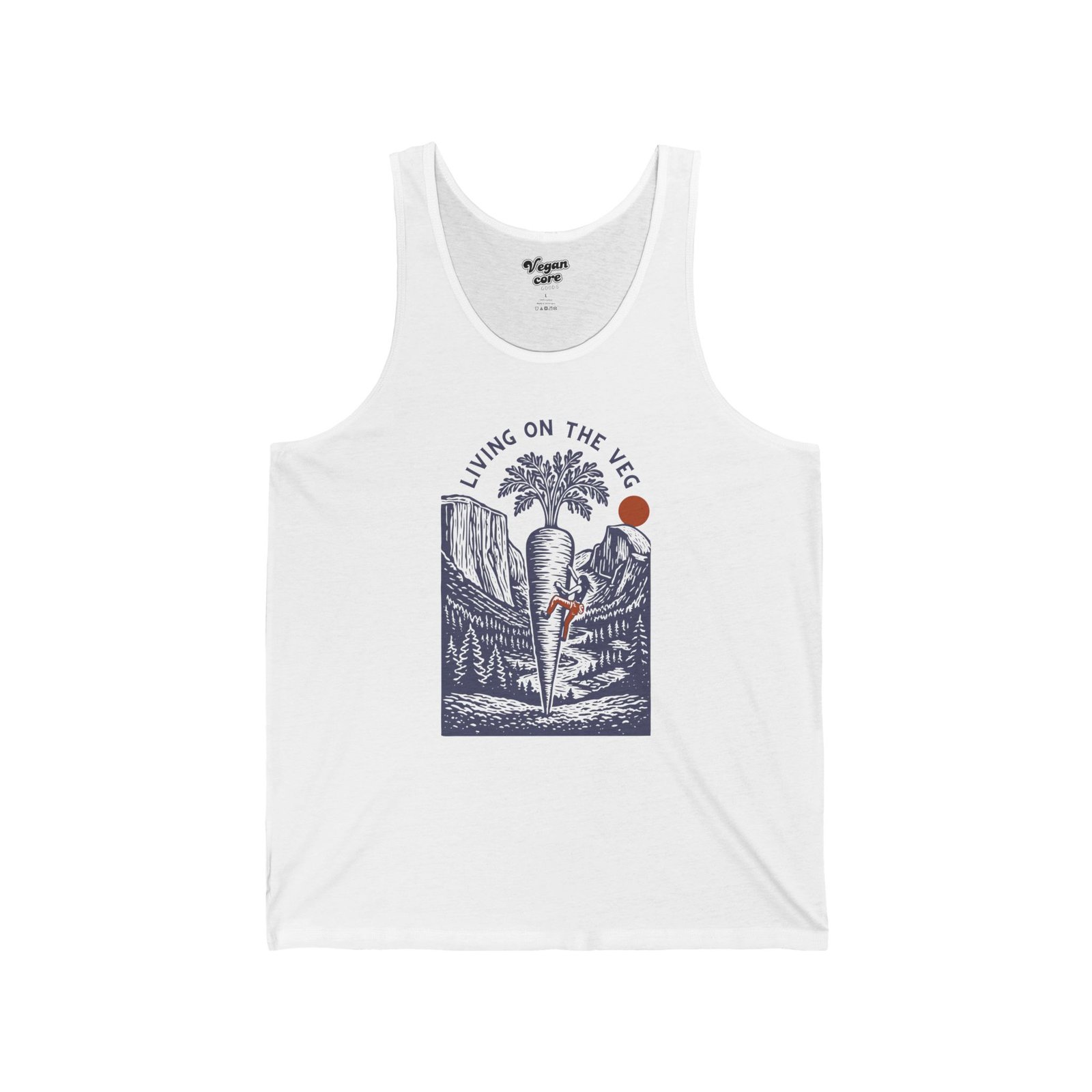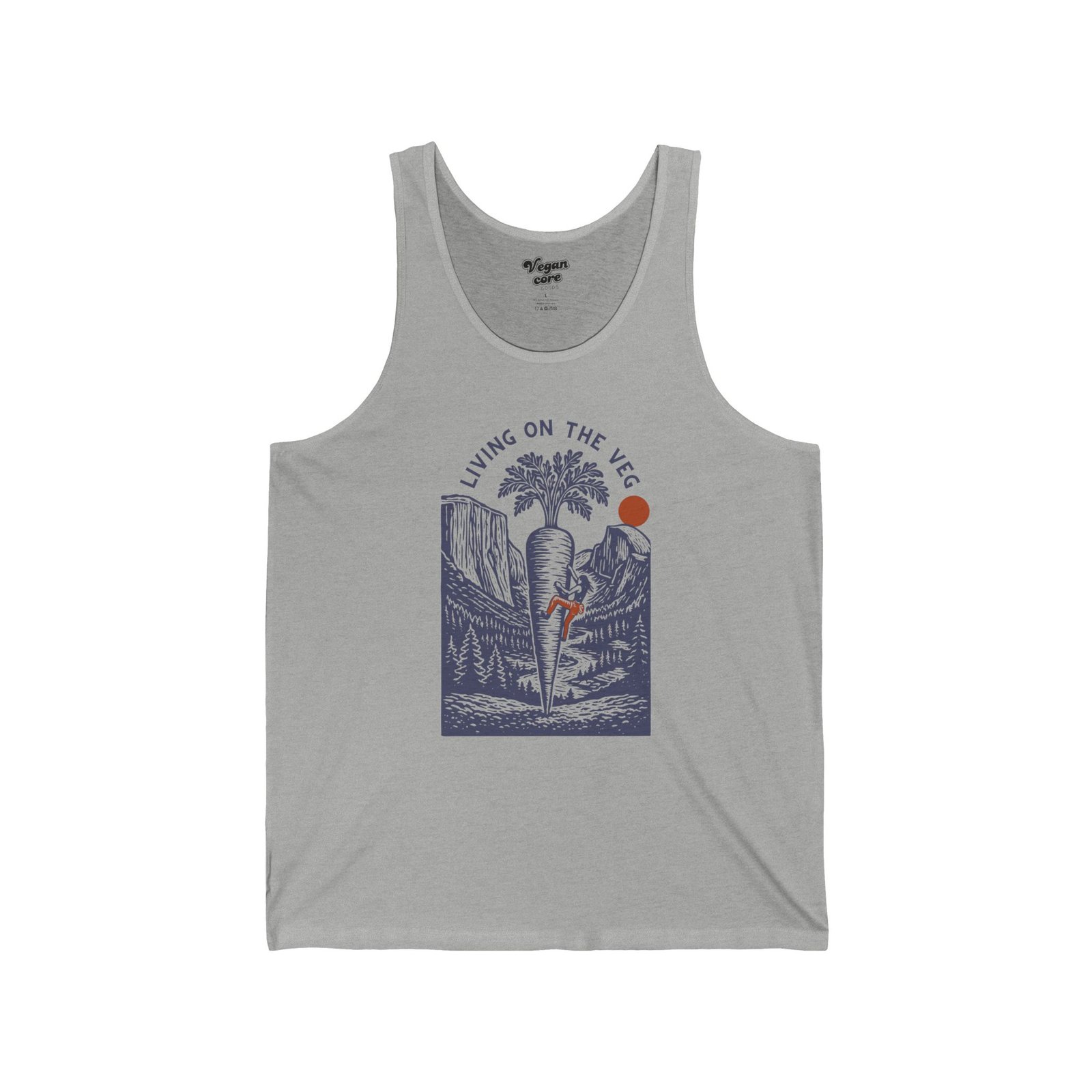 Living on the Veg 🌱⛰️ This bold, vintage-inspired design features a climber scaling the edge of a giant carrot monolith in Yosemite Valley with El Capitan and Half Dome in the background. A surreal mix of retro style and vegan outdoor adventure, it’s made for those who love to climb rocks, eat plants, and live cruelty-free.