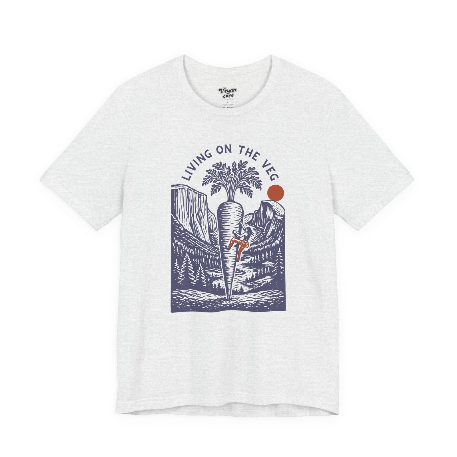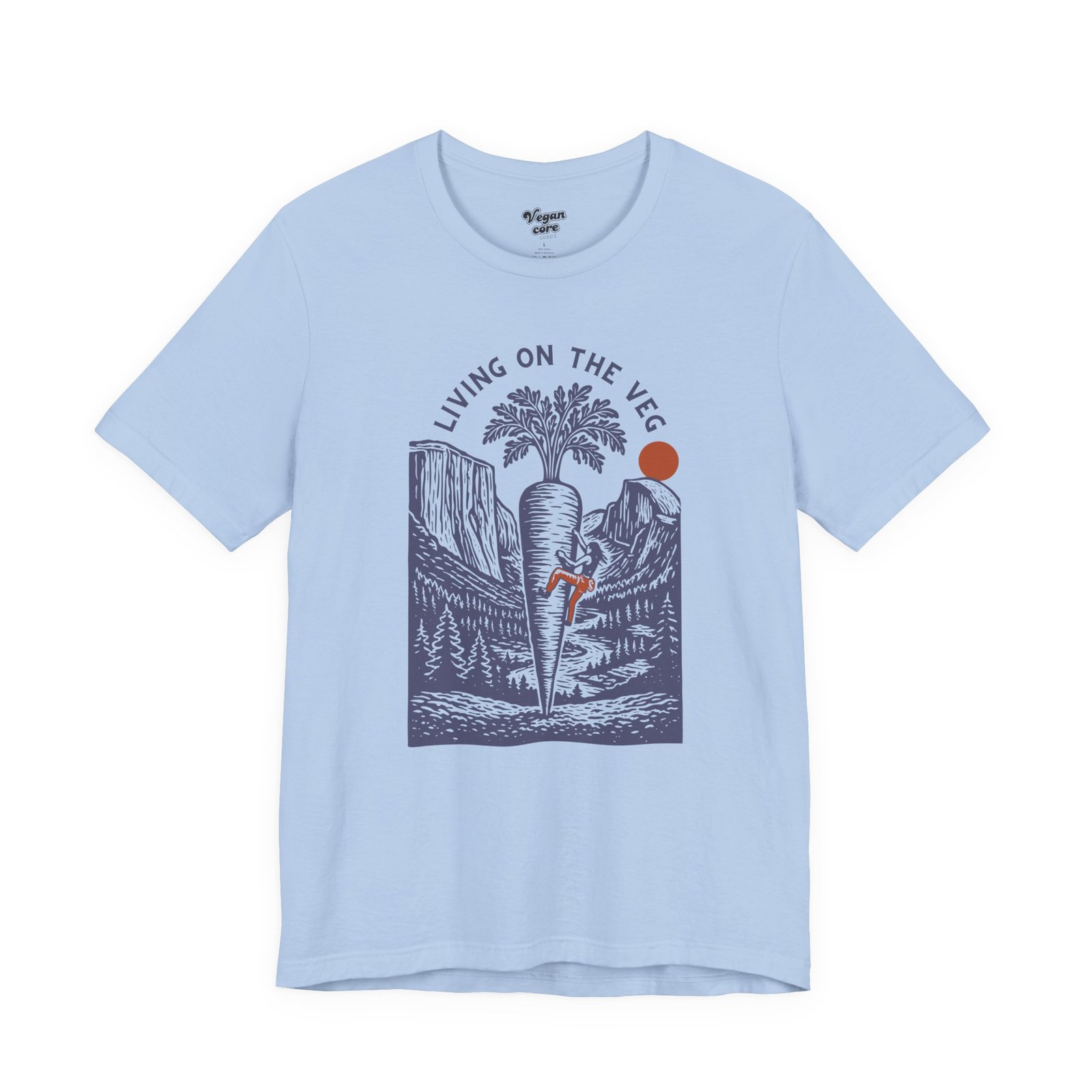 Living on the Veg This bold, vintage-inspired design features a climber scaling the edge of a giant carrot monolith in Yosemite Valley with El Capitan and Half Dome in the background. A surreal mix of retro style and vegan outdoor adventure, it’s made for those who love to climb rocks, eat plants, and live cruelty-free.