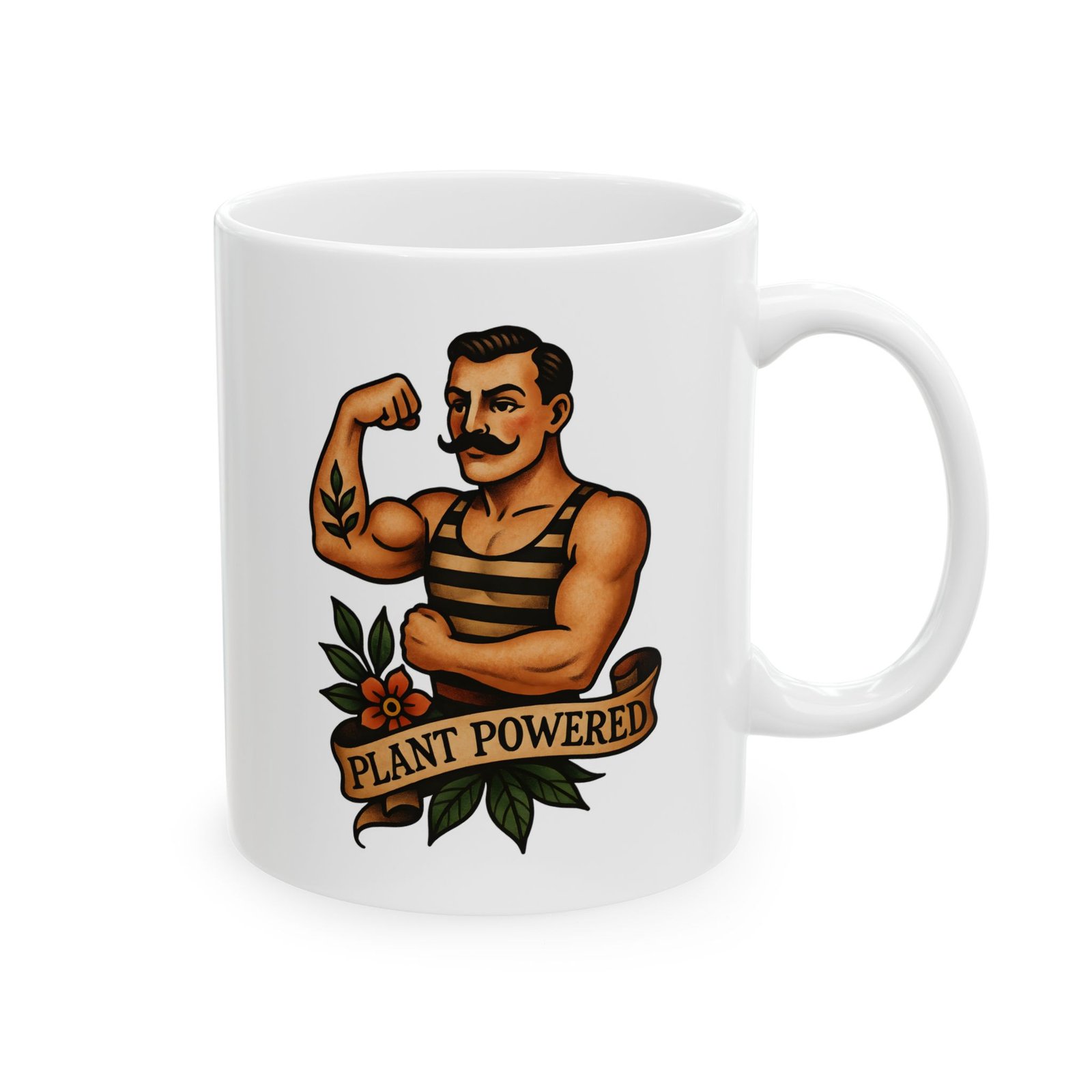 Start your day strong with this “Plant Powered” Strongman Mug — a retro-inspired vegan tattoo art design that flexes compassion and style. Featuring a vintage strongman illustration in bold traditional flash art colors with the empowering banner “PLANT POWERED,” this mug blends old-school ink aesthetics with modern vegan vibes. ☕