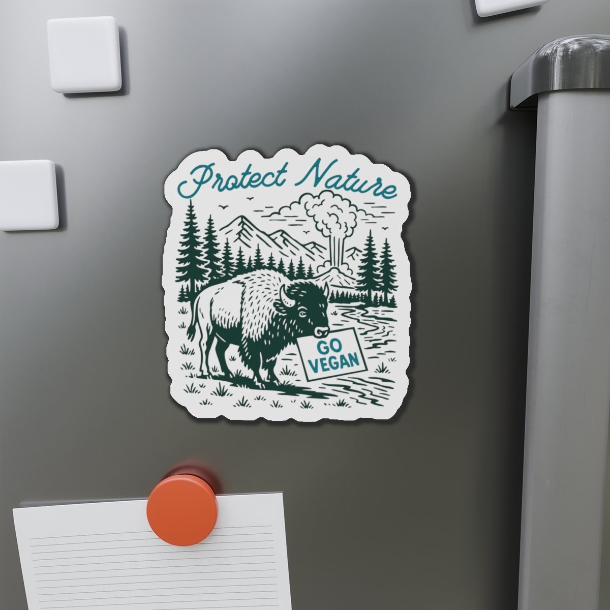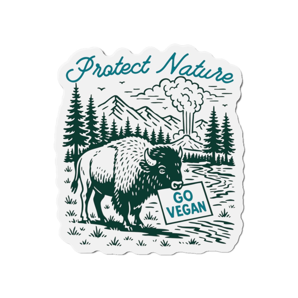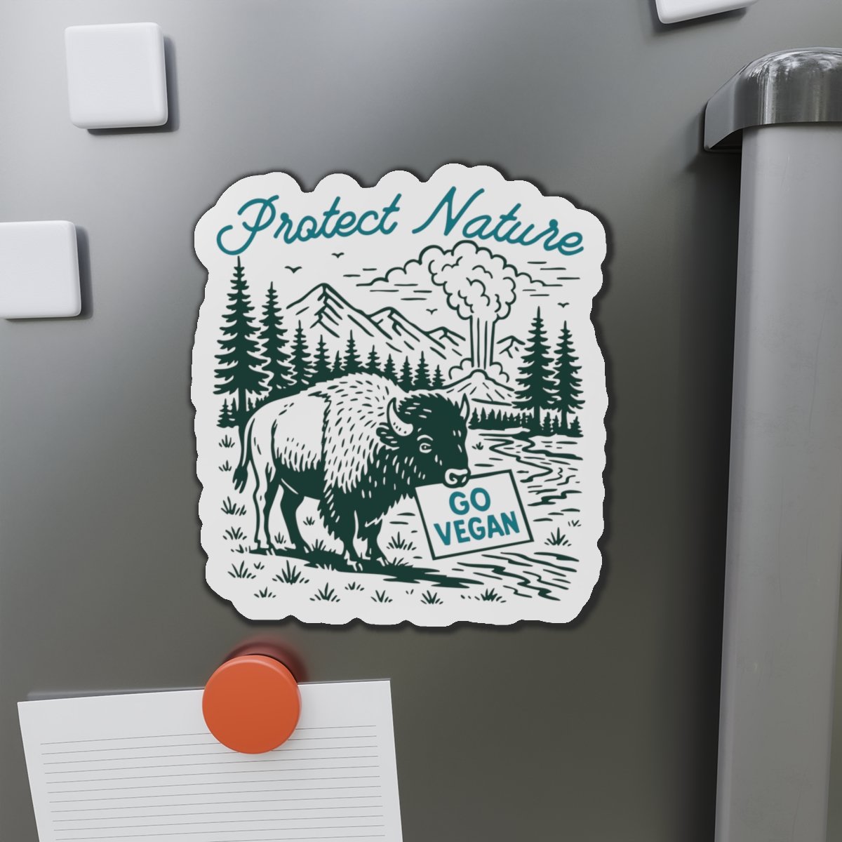 Protect Nature, Go Vegan. This retro vegan magnet features a bison holding a Go Vegan sign, set against a backdrop of Yellowstone’s mountains, pine trees, and a geyser. Designed in a vintage outdoor style, it makes a perfect eco friendly accent for your fridge, car, locker, or office space.