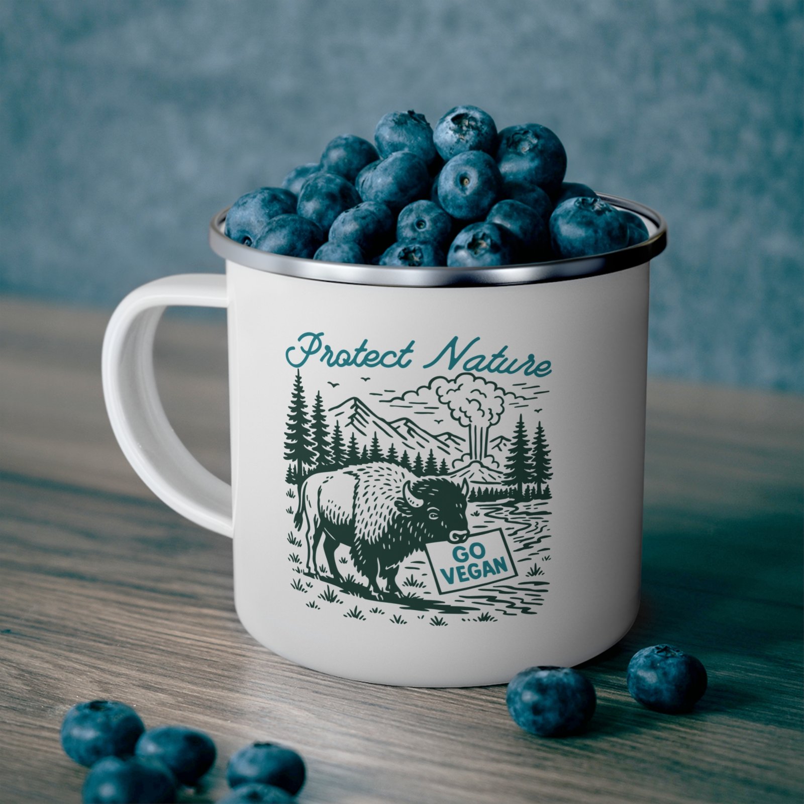 🌲 Protect Nature – Go Vegan 🌲 Sip your favorite trail drink in style with this enamel camping mug featuring a bold design of a bison carrying a “Go Vegan” sign against a wilderness backdrop of Yellowstone’s pine trees, mountains, and geysers. Vintage-inspired and rugged, this mug is perfect for your next camping trip, hiking adventure, or cozy cabin morning.