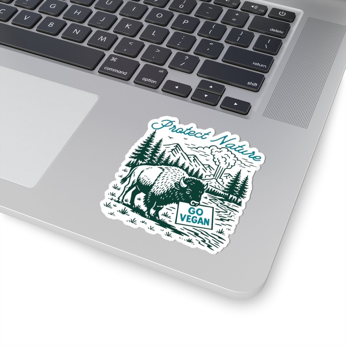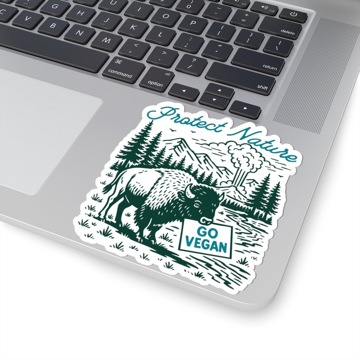 Protect Nature, Go Vegan. This retro vinyl sticker features a bison holding a Go Vegan sign with Yellowstone’s mountains, trees, and geysers in the background, created in a vintage outdoor style. Durable and weather resistant, perfect for decorating water bottles, laptops, journals, car windows, coolers, or any gear you take outdoors. A fun way to show off your plant powered lifestyle while spreading a message of kindness to animals and the planet.