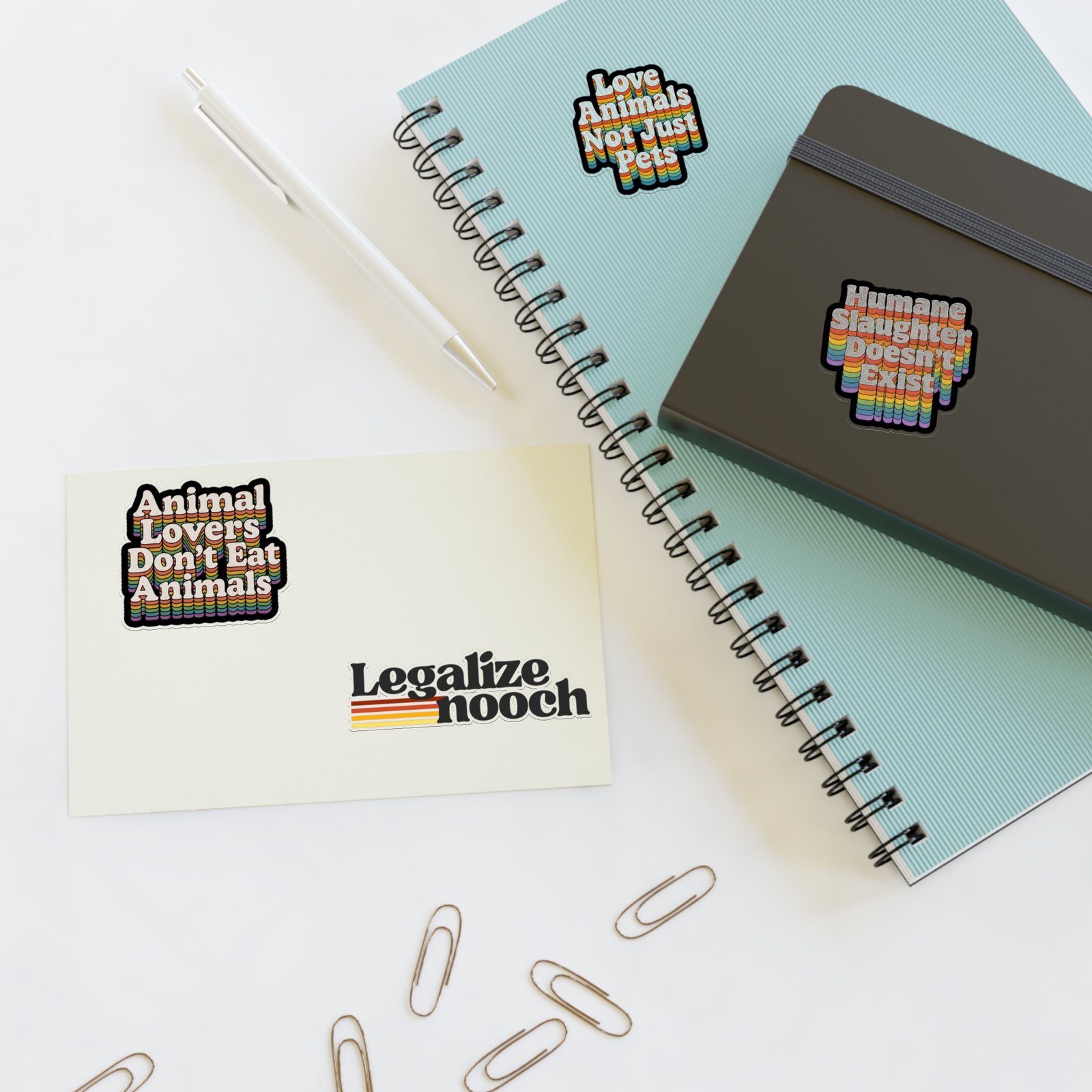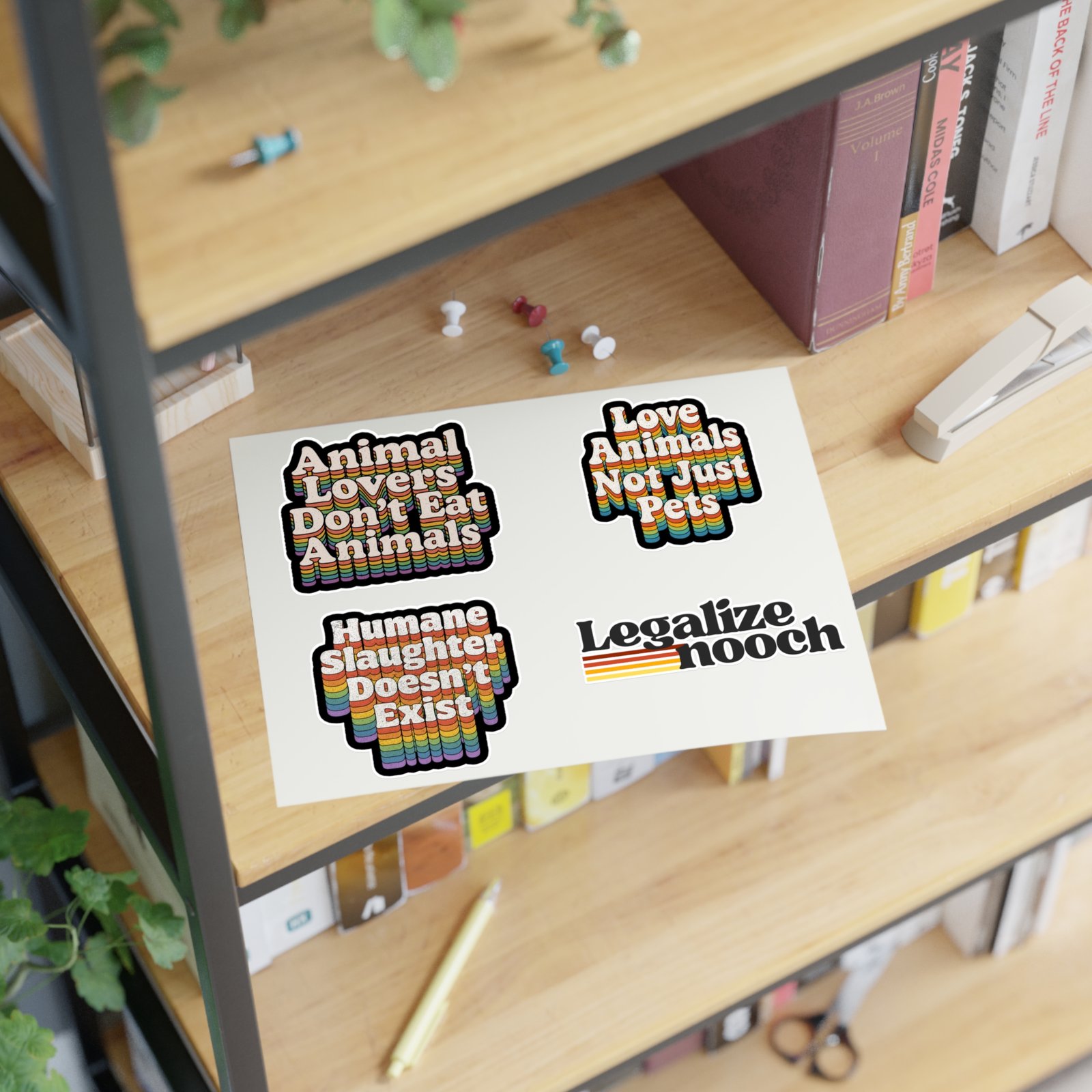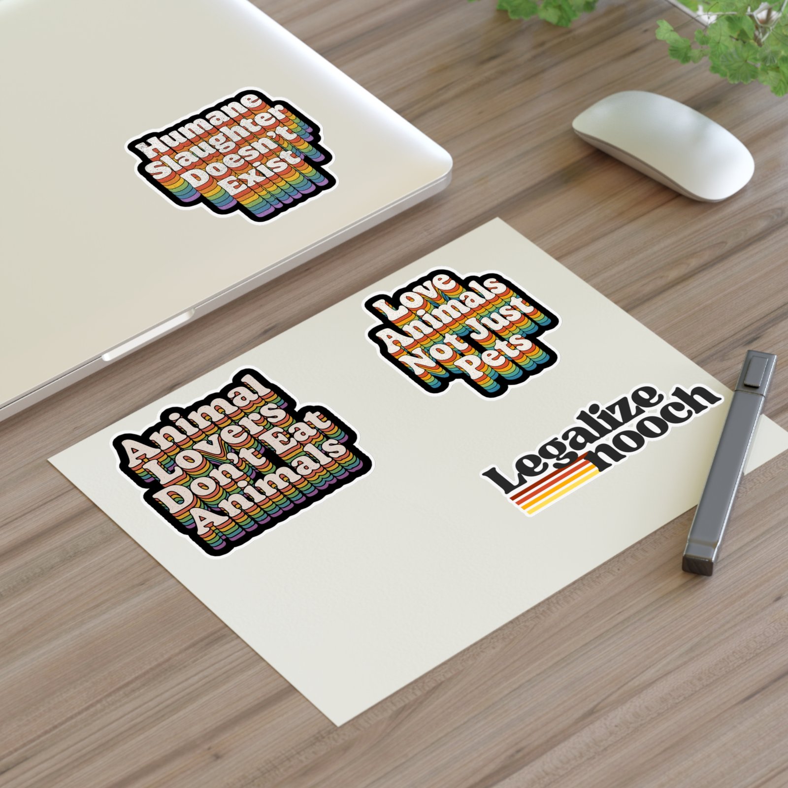 Featuring four bold 70s-inspired designs, each sticker blends nostalgic rainbow striping with modern vegan activism. Perfect for adding personality to your reusable water bottle, laptop, notebook, planner and more.