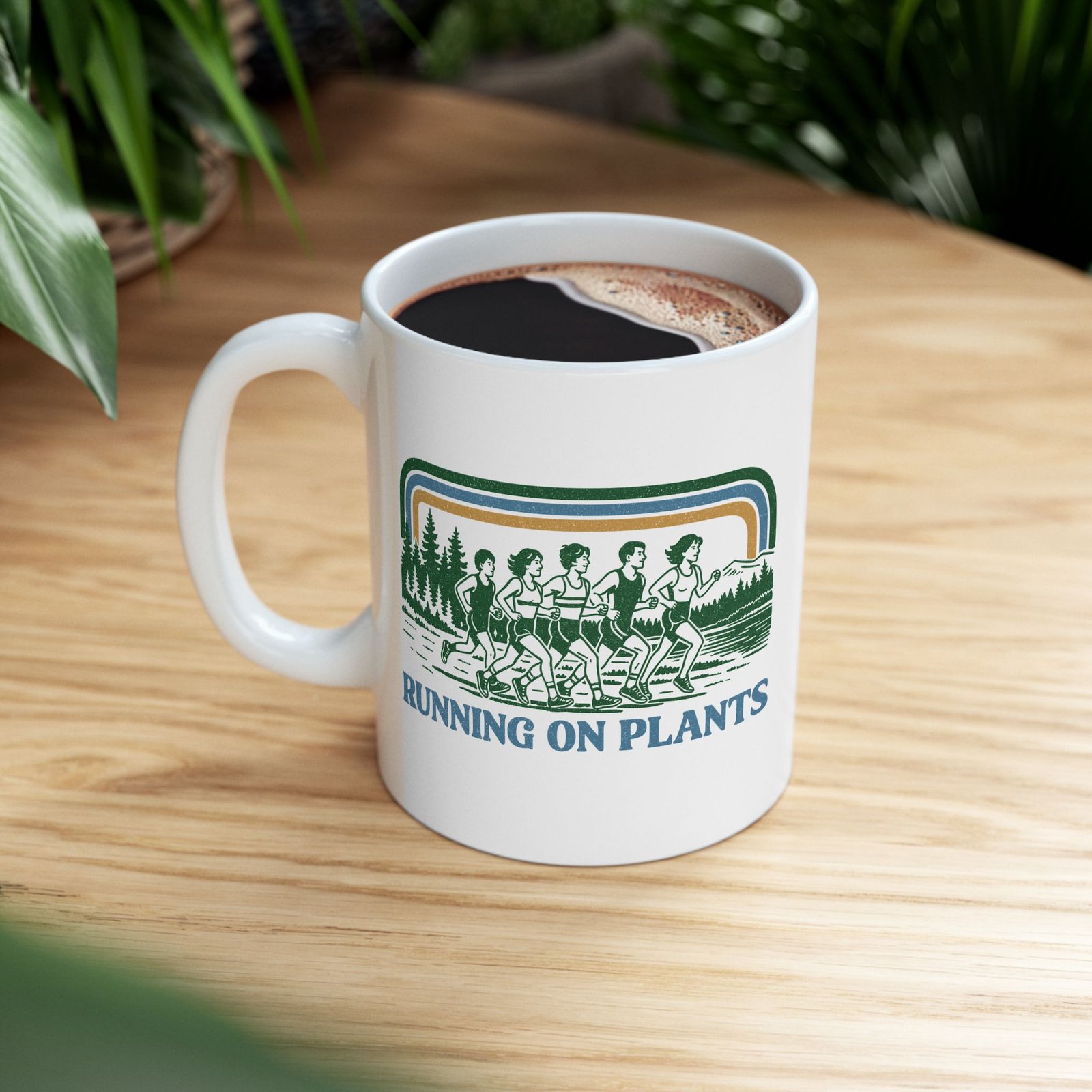 Fuel your mornings the plant-powered way with this Running on Plants retro runner mug. Featuring runners in 80s athletic gear, retro stripes, and distressed vintage print, this mug is perfect for vegans, athletes, and coffee lovers who like to start their day strong.