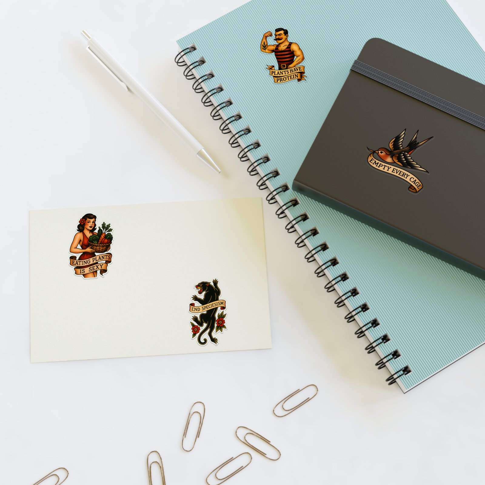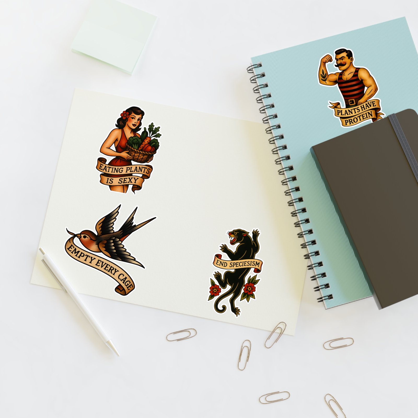 Four designs. One compassionate message. This retro vegan tattoo sticker sheet brings together four of our most popular flash-style designs — perfect for laptops, water bottles, journals, or wherever you want to spread some vintage vegan attitude.